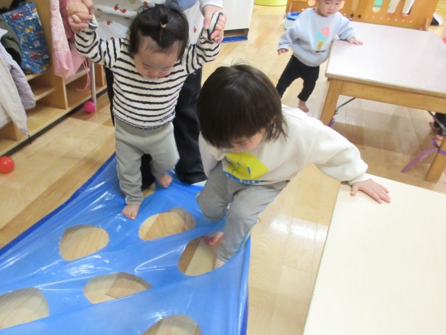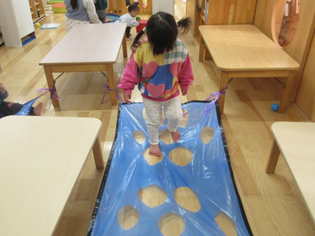 カラーポリ袋に穴をあけて作った道を用意すると、穴を見つけ慎重に足を入れて歩く姿が見られ、とても可愛らしかったです。