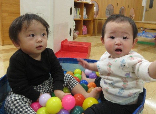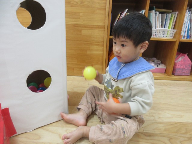 ボールコーナーでは、30秒の間にたくさん入るかな、とスタートしました。「パンダの口に向かって投げて入った!」「レインボータワーの高い所にもう少しで入りそうやった」と嬉しそうだったり悔しそうだったりの子ども達でした。