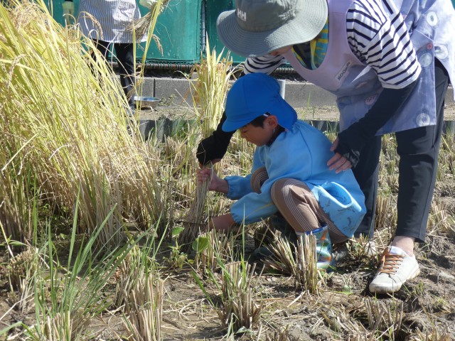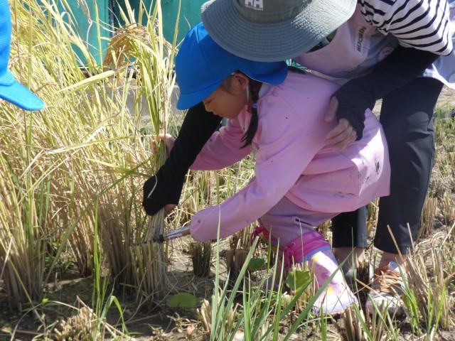 すがすがしい秋晴れの中、青バッジのみんなで稲刈りをしました。かまで「ぎこぎこ」と一生懸命、真剣な表情で稲を刈っていました。
