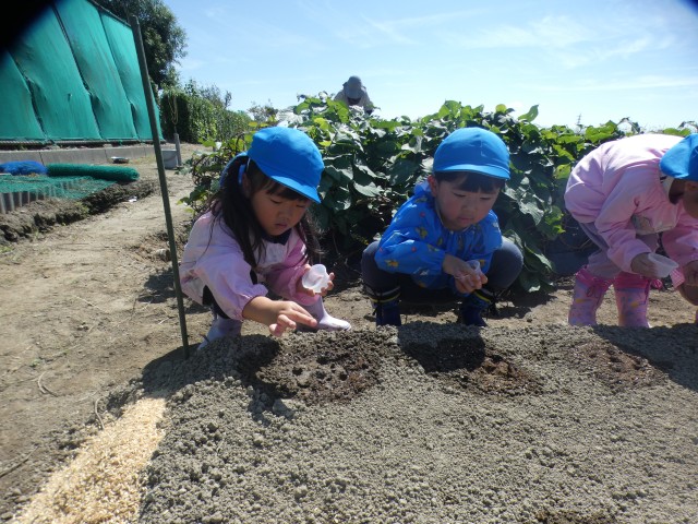 小さな穴に小さな小さな赤い大根の種を、大事そうにそうっと種を持ち、一つずつ丁寧に植えました。植えたところに、土をやさしくかけて、さらに上からもみ殻をパラパラっとかけることを教わり、自分の植えた場所を見ながら満足そうにしていた青バッジさんでした。