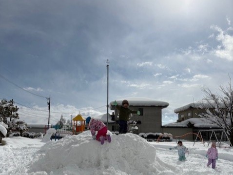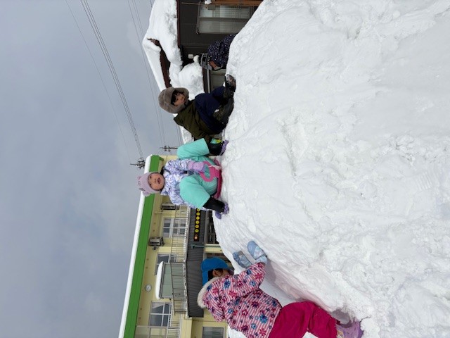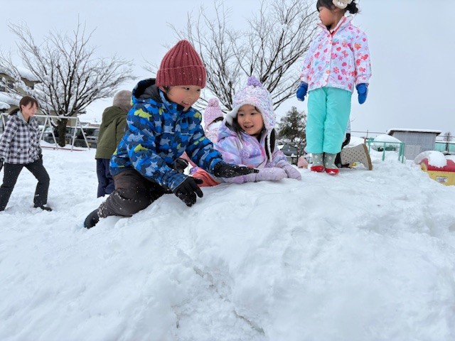 理事長先生が大きな雪の山を2つ作ってくださったので、ウエアを履いたおしりでキャー!と大笑いしながらすべる子ども達!山を登ってはすべり登ってはすべり…を繰り返し楽しんでいました。