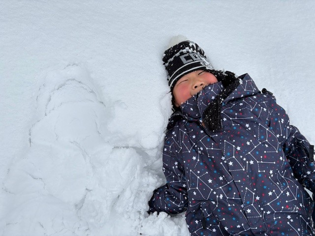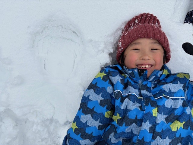 ふわふわの雪だったので、まだ足あとのついていない雪に顔を押しつけるようにして「顔拓」をとりました!「つめたーーい!!!」と言いながらも大笑い♪顔拓のとなりで記念写真を撮りましたよ!見えますか?
