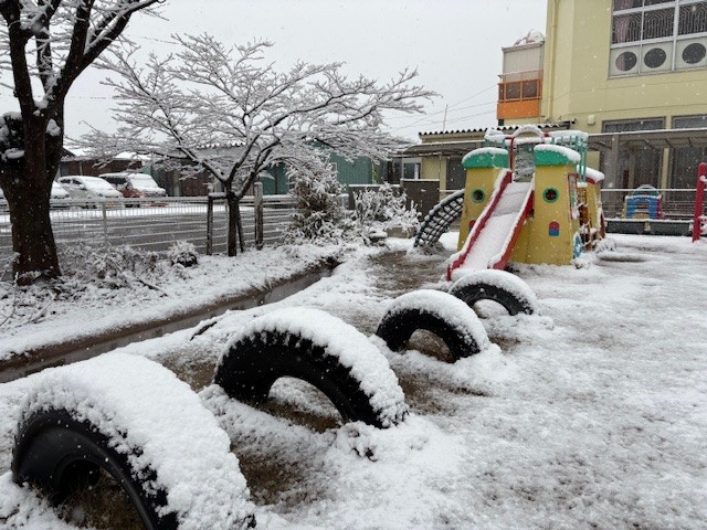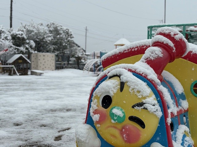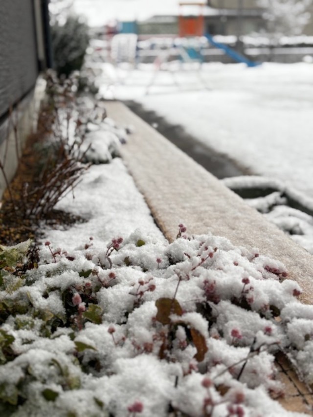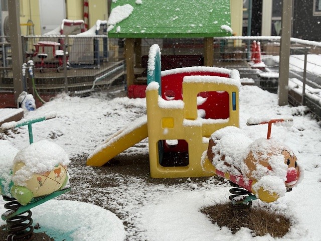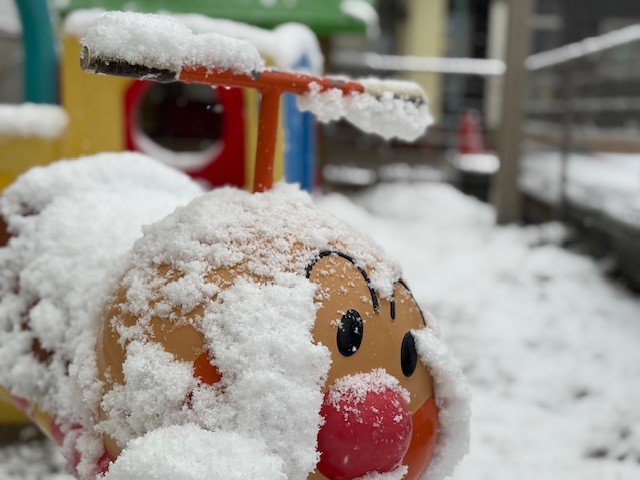 園庭の遊具もお花もアンパンマンもみんな雪化粧です。