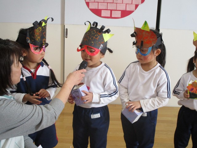 鬼の登場にはみんな驚いていましたが、青バッチ(年長さん)が豆をまいたり、ひいらぎといわしを使って鬼をやっつけてくれました。