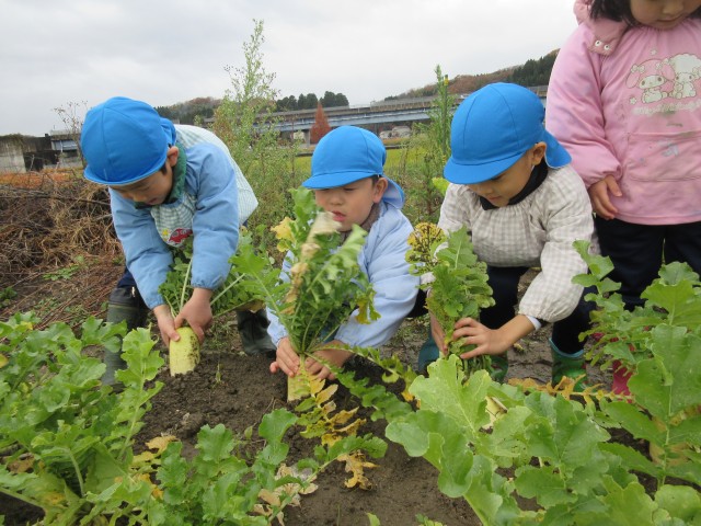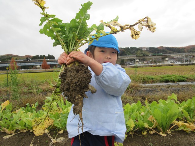 稲刈り・脱穀・精米、大根の種まき、芋ほり。収穫祭で炊いたご飯でおにぎりを作って食べます。